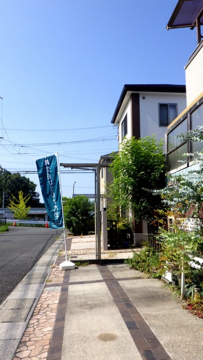 今回の教室は住宅街の中なので、最寄り駅からの道案内のために“のぼり”を持ってスタンバイ。